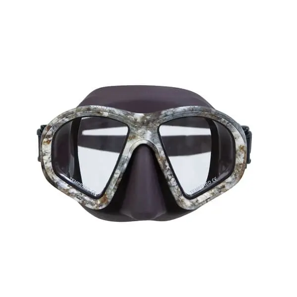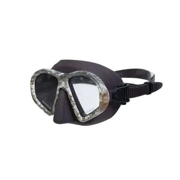 Εύκολη ρύθμιση στο πρόσωπο από τα εργονομικά και περιστρεφόμενα κλιπς. Σε καφέ χρώμα με σχέδιο παραλλαγής στο πλαίσιο. Κατάλληλη για ψαροντούφεκο και ελεύθερη κατάδυση