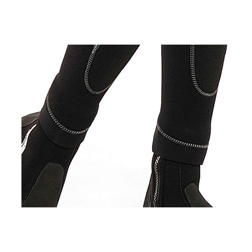 – Το σύστημα των aqua stop της στολής αποτελείται από μαλακά τμήματα neopren 1,5 χιλιοστών τα οποία εσωτερικά είναι λεία και είναι τοποθετημένο στους καρπούς και στους αστραγάλους και γύρω από το πρόσωπο ενώ οι περιοχές στα γόνατα προστατεύονται από τη φθορά και τα τριψίματα από ενισχύσεις με “Powertex”.